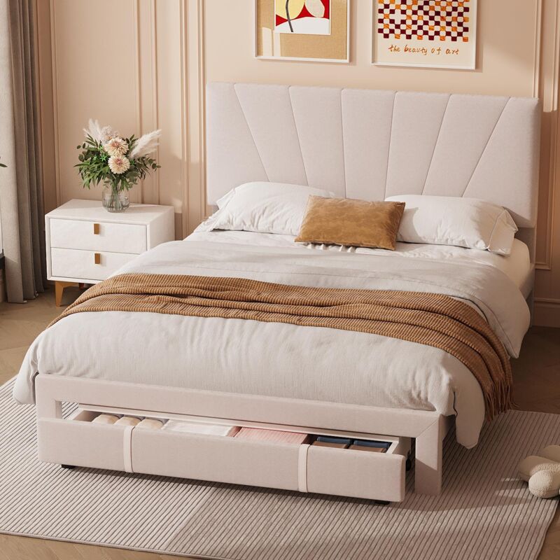 Eifson - Lit 140x200 cm, avec grand tiroir au pied du lit, dossier capitonné, velours, style scandinave, sommier à lattes, structure métal - Beige