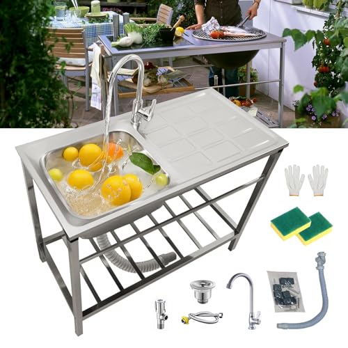 Lavabo Commercial De Cuisine Autoportant En 304 Acier Inox 1 Bac évier Extérieur Jardin Sur Pieds Évier Utilitaire Avec Robinet/établi Pour Restaurant/Sous-Sol/Bar/Hôtel Peu Encombrant(75x40xH75cm)