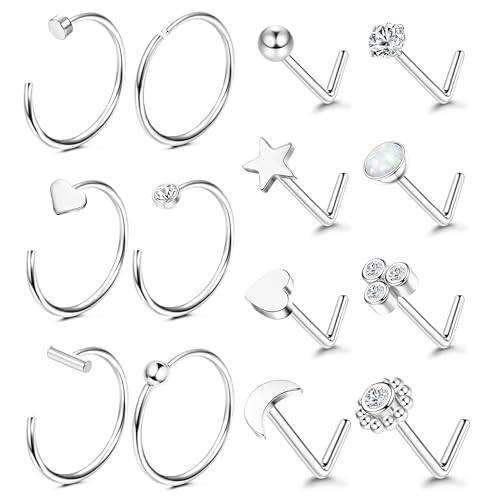 Adramata 12Pcs Nez Anneau 10Pcs Chaîne de Nez Acier Chirurgical Piercing au Nez pour Double Piercing de Nez 20G Nez Stud Argent Anneau de Nez pour Femme Homme