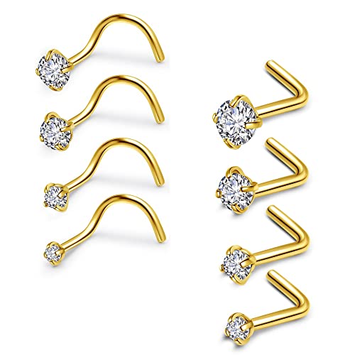 PiercingJak 8Pcs Piercings Nez Courbe Tige L Zirconium 20Ga Anneau Boucle de Nez Acier Inoxydable Piercing au Nez Lot Strass Blanc 1,5mm/2,0mm/2,5mm/3,0mm Bijoux de Corps Femme Homme-Or