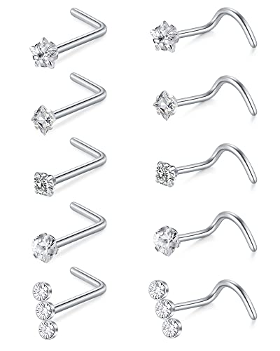 VFUN Anneau de Nez Étoile en Acier Inoxydable 22G, 10 Pièces Argent, Piercing au Nez Coeur, Piercing Nez Vis L Forme Diamant CZ