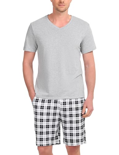 Bresdk Pyjama Court Homme Coton Ensembles de Pyjama Ete Vêtements de Nuit Chemise col V Manches Courtes Pijamas 2 Pièce, Plaid - Gris foncé, S