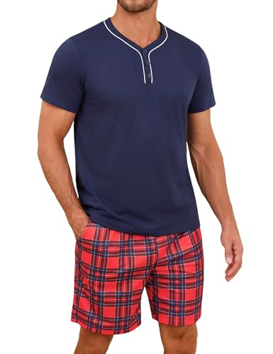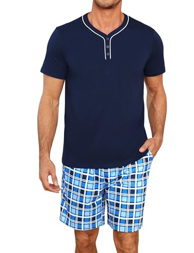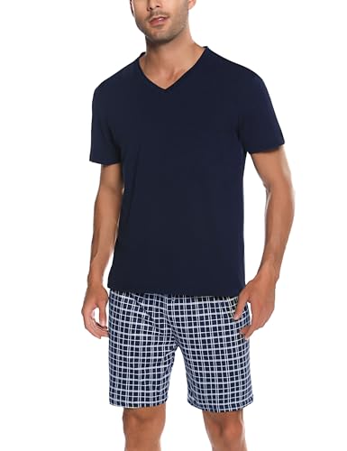 Bresdk Pyjama Court Homme Coton Ensembles de Pyjama Ete Vêtements de Nuit Chemise col V Manches Courtes Pijamas 2 Pièce, Plaid - Bleu Marine, M