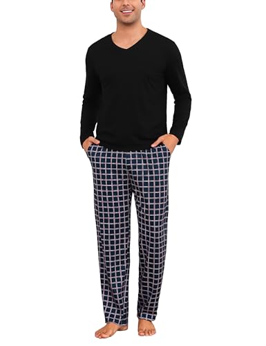 Bresdk Ensembles de Pyjama Homme Long Coton Pijamas Hiver 2 Pièce Vêtements de Nuit Chaud et Doux, Noir/Marine, M