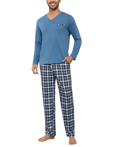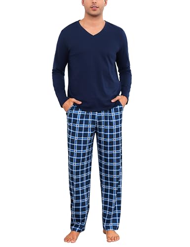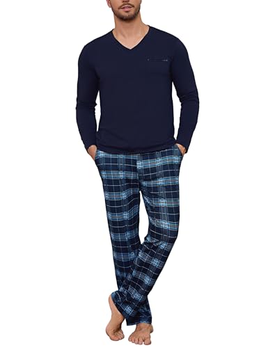Bresdk Ensembles de Pyjama Homme Coton Hiver Manches Longues Pijamas col V Vêtements de Nuit Doux Loungewear avec Poche Poitrine, Bleu foncé, M