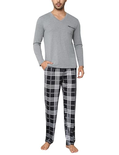 Bresdk Ensembles de Pyjama Homme Coton Hiver Manches Longues Pijamas col V Vêtements de Nuit Doux Loungewear avec Poche Poitrine, Gris, M
