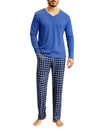 Bresdk Ensembles de Pyjama Homme Coton Hiver Manches Longues Pijamas col V Vêtements de Nuit Doux Loungewear avec Poche Poitrine, Bleu Cobalt, L