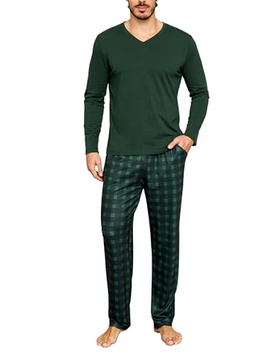 Bresdk Ensembles de Pyjama Homme Coton Hiver Manches Longues Pijamas col V Vêtements de Nuit Doux Loungewear avec Poche Poitrine, Vert, M