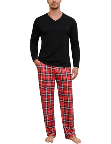 Bresdk Ensembles de Pyjama Homme Long Coton Pijamas Hiver 2 Pièce Vêtements de Nuit Chaud et Doux, Noir/Rouge, XL