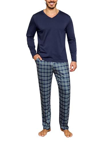 Bresdk Ensembles de Pyjama Homme Long Coton Pijamas Hiver 2 Pièce Vêtements de Nuit Chaud et Doux, Bleu Marine/Vert, M