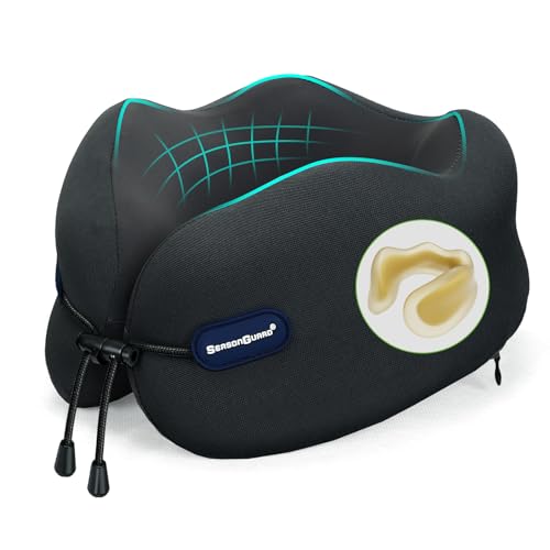 Season Guard Travel Pillow, Head Support Neck Pillow for Traveling, Pure Memory Foam Travel Pillows for Flight Headrest Sleep, Airplane Car Home Use, A02 Wide Strape with Breathable Cover, Black
