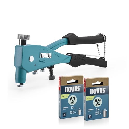 NOVUS TOOLS Pince à écrou à riveter N-120 avec 40 écrous à riveter, pince à écrou à riveter professionnelle universelle avec tête de précision, embouts M4/M5/M6 intégrés avec mandrin fileté, pour