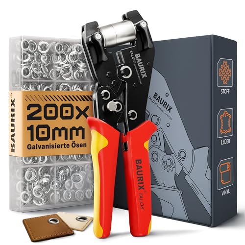 BAURIX® Pince à Oeillets avec 200 œillets (Ø10 mm) – Auto-perforante sans Pré-trou – pour Bâches, Tissus, Cuir & Textiles – pour Couturières, Bricoleurs & Artisans - TALOS