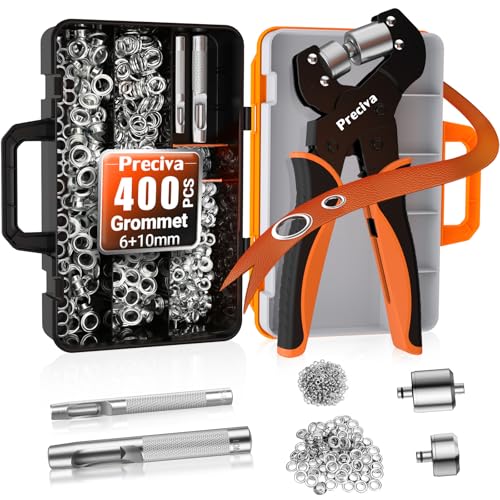 Pince à Oeillets, Preciva 6+10mm Tête de remplacement Pince à Oeillet Magnétique avec 400 Oeillets et 2 Ciseaux de Perforation Boîte à Outils, Pince à Cliquet pour Baffiches, Bannières en PVC