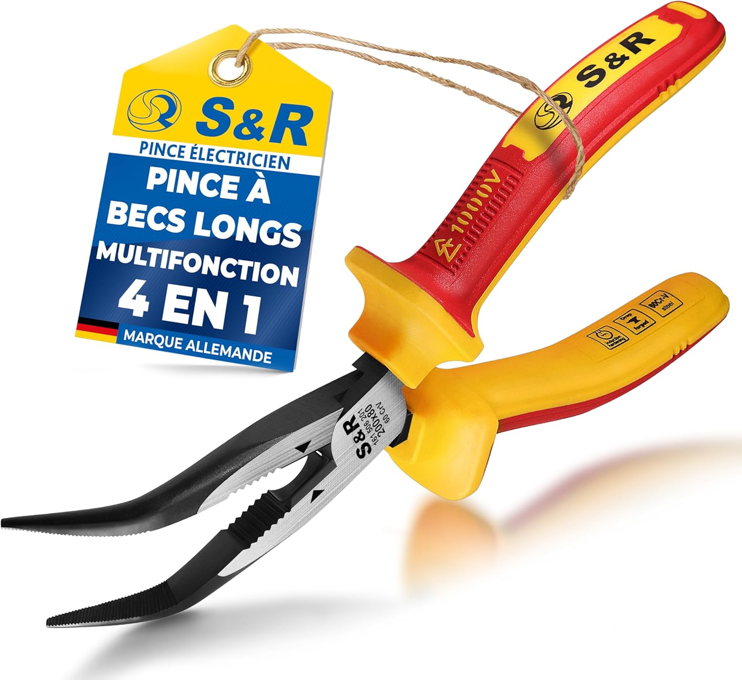 S&R Pince Électricien VDE 1000V. Pince à Bec Long Plat Multifonction pour Couper, Dénuder, Saisir Câbles – Pince Coupante Isolée 220 mm – Acier 60CrV Professionnel