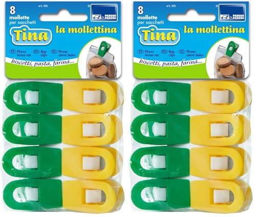 PARODI & PARODI – Pince Fermeture Sachet Alimentaire, Aussi Comme Pince à Linge Plastique Résistante - Épingle à Linge et pour Sacs Biscuits, Pâtes, Aliments, Épingles Jaune/Vert, Lot 8 Pinces 10x17x3
