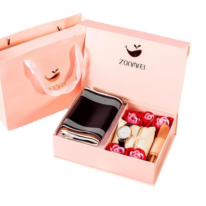 Coffret montre femme + écharpe en soie + pinceau de maquillage + bracelet + fleur rose -ensemble cadeau 4 pièces de haute qualité