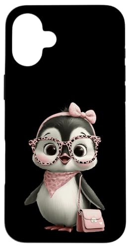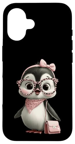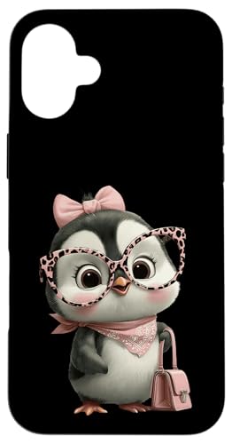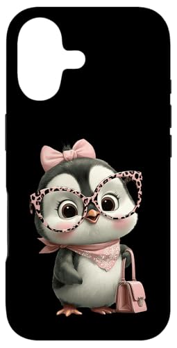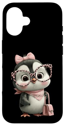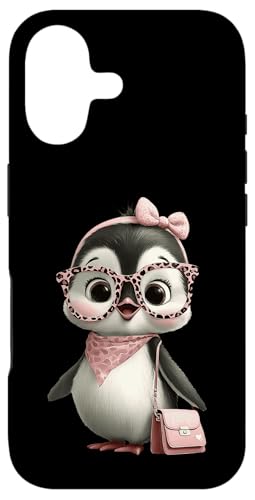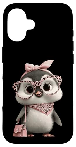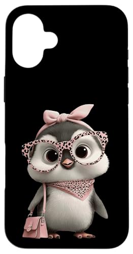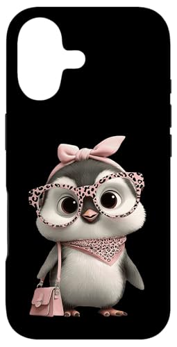 Lunettes Bébé Pingouin Kawaii Personnage Rose Léopard Portrait Coque pour iPhone 16 Plus