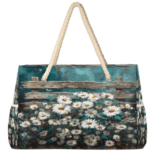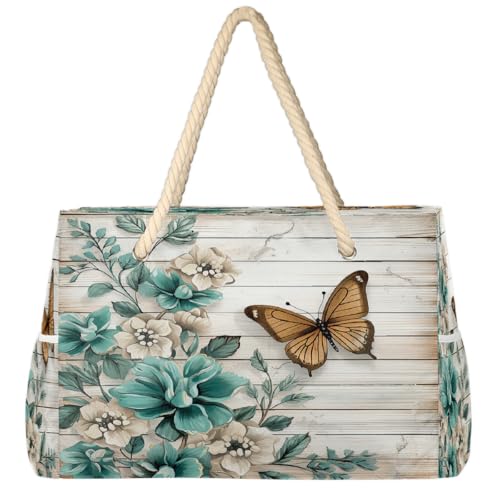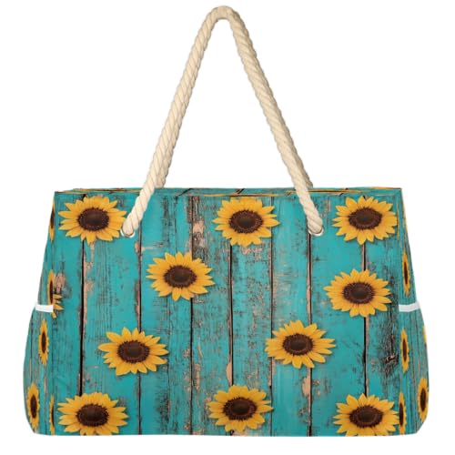 Dusviba Grand sac fourre-tout de plage vintage en bois turquoise avec fermeture éclair, imperméable, résistant au sable, avec poignées en corde, plusieurs poches pour femme, voyage, piscine, salle de