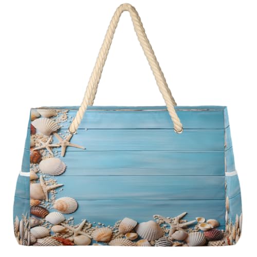 Dusviba Grand sac fourre-tout de plage en bois, coquillage, étoile de mer avec fermeture éclair, imperméable, résistant au sable, avec poignées en corde, plusieurs poches pour femme, voyage, piscine