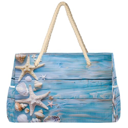 Dusviba Grand sac fourre-tout de plage en bois, coquillages, étoile de mer avec fermeture éclair, imperméable, résistant au sable, avec poignées en corde, plusieurs poches pour femme, voyage, piscine