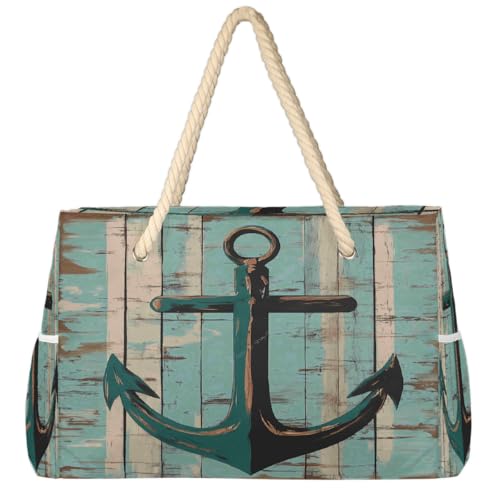 Dusviba Anchor Grand sac fourre-tout de plage en bois turquoise avec fermeture éclair, imperméable, résistant au sable, avec poignées en corde, plusieurs poches pour femme, voyage, piscine, salle de
