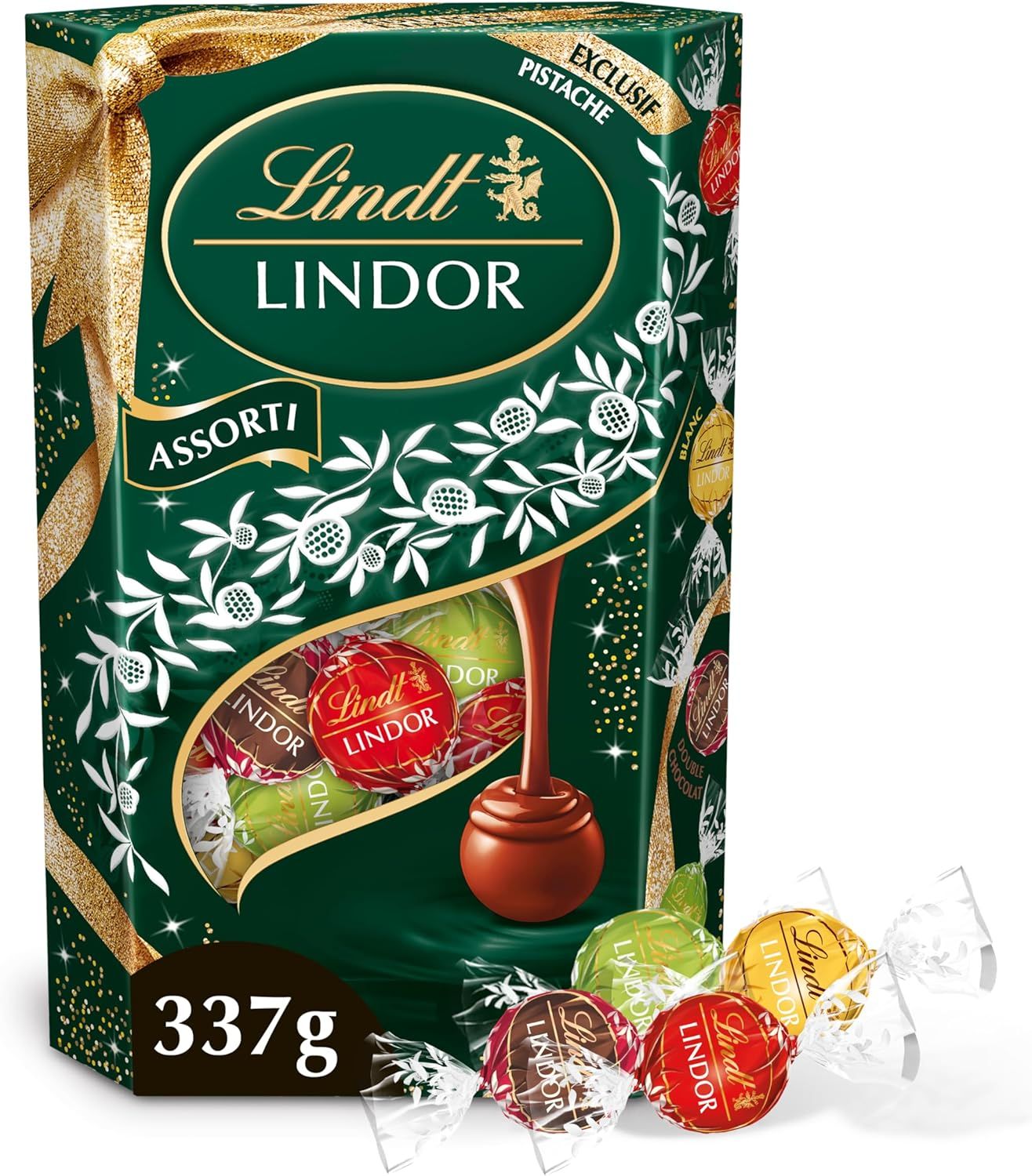 Cornet Lindor Festive Ribbon Edition-Assorted Milk Chocolates,White,Double Chocolate And Pistachios-Fondant Heart-Ideal For Christmas,337g