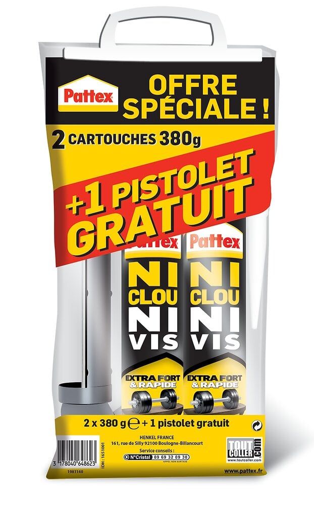 Colle Fixation PATTEX Ni Clou Ni Vis Extra Fort & Rapide 2x380g +?1 Pistolet