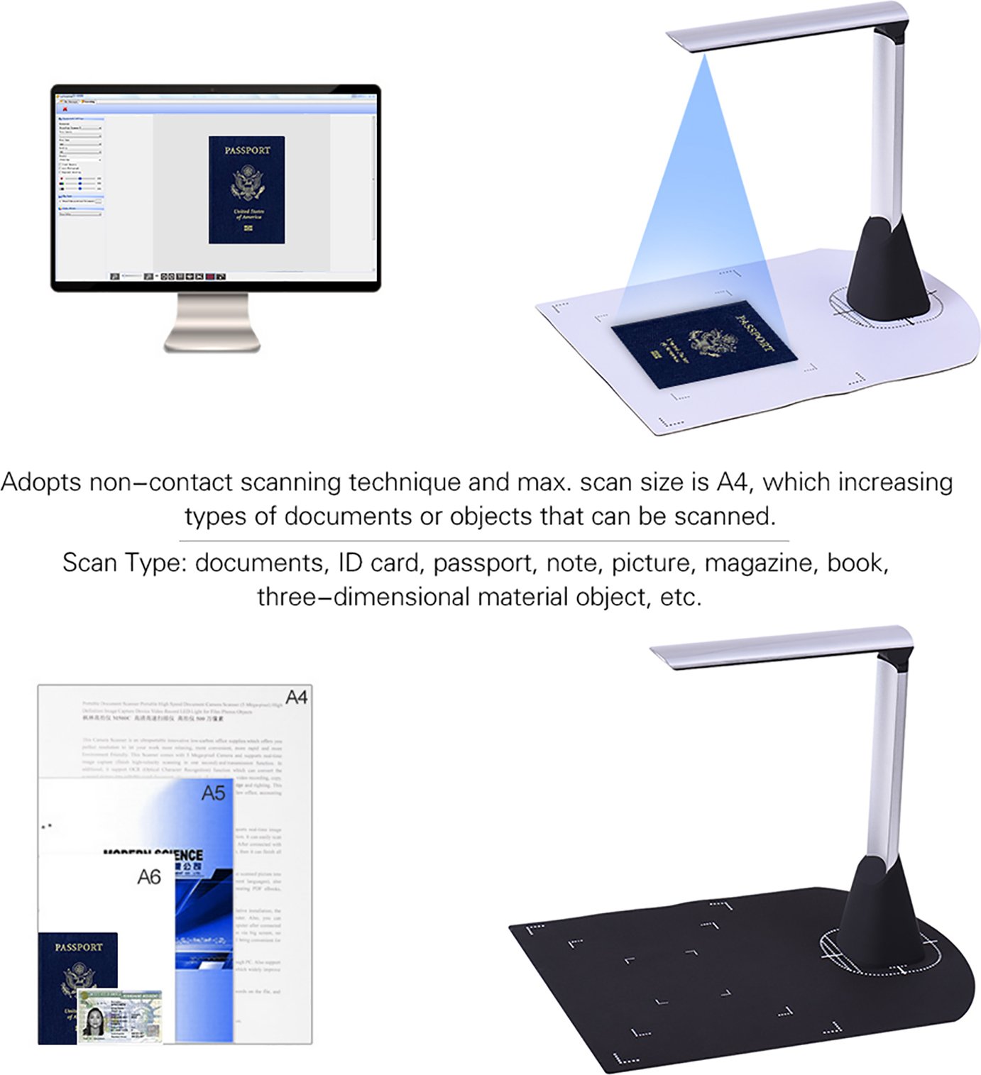 Scanner USB portable à grande vitesse pour livres, documents et images Haute Définition 5 Mega-pixel HD Max. A4 avec fonction OCR Lumière LED pour salle de classe, bureau, bibliothèque, banque