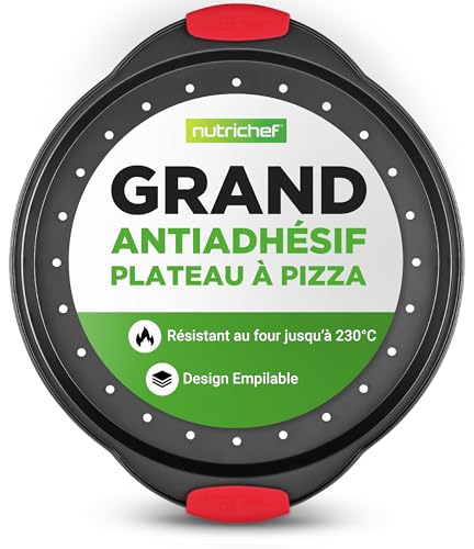 NutriChef Plaque à Pizza Antiadhésive - avec Poignée en Silicone, Pan Rond en Acier Non-adhésif avec Trous Perforés, Ustensiles de Cuisine de Qualité, Plaque à Pizza avec Poignée Silicone et Poignée
