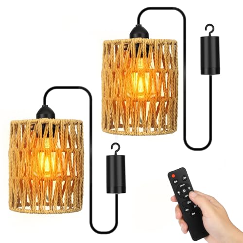 Strixorn 2x Plafonnier en Rotin à Piles, Lampe E27 sur Batterie avec Télécommande, IP65 Étanche, Dimmable, Minuterie, Plafonnier sans Alimentation pour Intérieur Extérieur Jardin Balcon Camping Fêtes