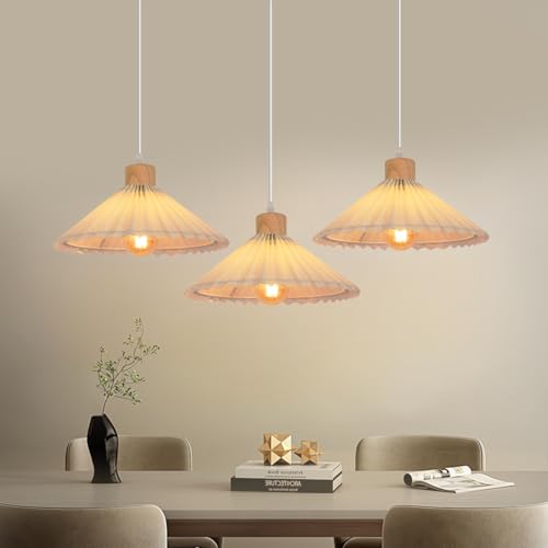 Goeco Suspension Luminaire en Bois, 3 Lumières Lampe Suspension Rétro E27 Avec Abat-jour en Tissu, Plafonnier Blanc pour Salle à Manger Chambre Salon Couloirs (Sans Ampoule)