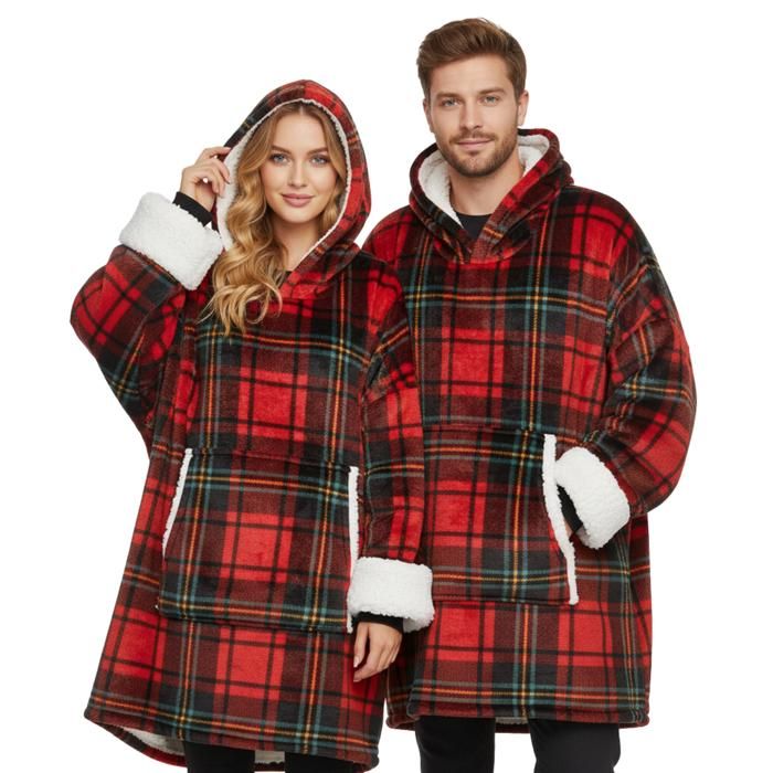 Plaid Pull Sweat à Manche et Capuche avec Poche – Taille Unique 118 x 85 cm - Homme et Femme - Intérieur Sherpa - Coloris Tartan