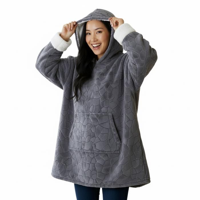 Plaid Pull Sweat à Manche et Capuche avec Poche – Taille Unique - Adulte Mixte - Intérieur Sherpa - Coloris Gris Effet Nid