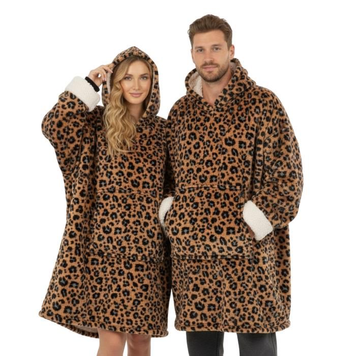 Plaid Pull Sweat à Manche et Capuche avec Poche – Taille Unique 118 x 85 cm - Homme et Femme - Intérieur Sherpa - Coloris Léopard