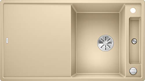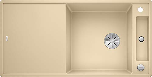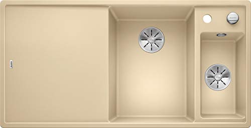 BLANCO 523468 Axia III 6 S 6 S SILGRANIT PuraDur avec télécommande d'écoulement, planche à découper en bois + Bac à droite, champagne