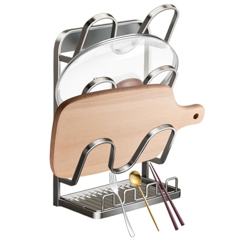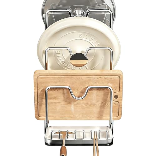 Support de couvercle de casserole – Rangement peu encombrant avec plateau de vidange, support pour couvercle de cuisine, planche à découper, assiette, placard, comptoir, garde-manger, maison