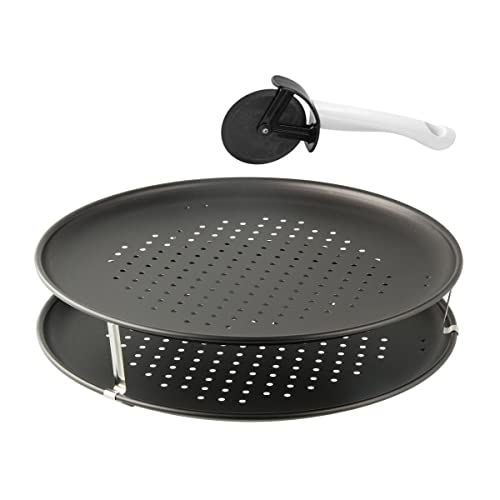 Zenker 7512 Set de 2 plaques à pizza perforée et une roulette à pizza, plaque a pizza, plaque cuisson pizza surgelée, plat pizza, plaque de cuisson perforée, Acier, Nylon, 32 cm
