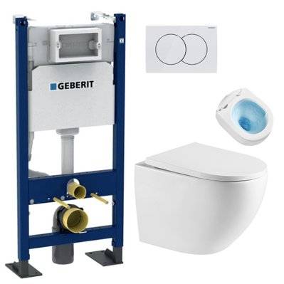 Geberit - Pack WC Bati-support Geberit Duofix + WC sans bride Swiss Aqua Technologies + Plaque de commande Delta01 Blanche...