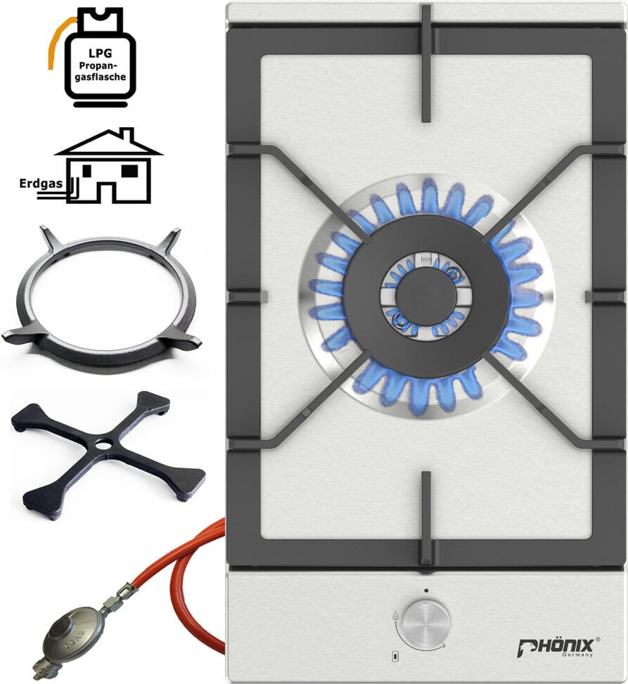 Phönix 301SL Plaque de cuisson à gaz inox Réchaud à gaz 1 feu 4 KW + support wok en fonte + croix de cuisinière