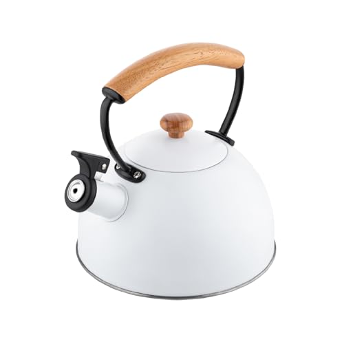 FLORINA Bouilloire en acier inoxydable NATURA (2,3 l) | Bouilloire sifflante avec poignée en bois | Sifflet automatique | Bouilloire pour plaque à induction, gazinière et plaque électrique | Blanc
