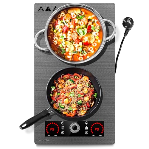 Plaque Induction 2 Feux, AMZCHEF Domino plaque de cuisson à induction avec 9 niveaux de puissance et fonction Boost, serrure de sécurité et minuterie 1-99 minutes, 3300w