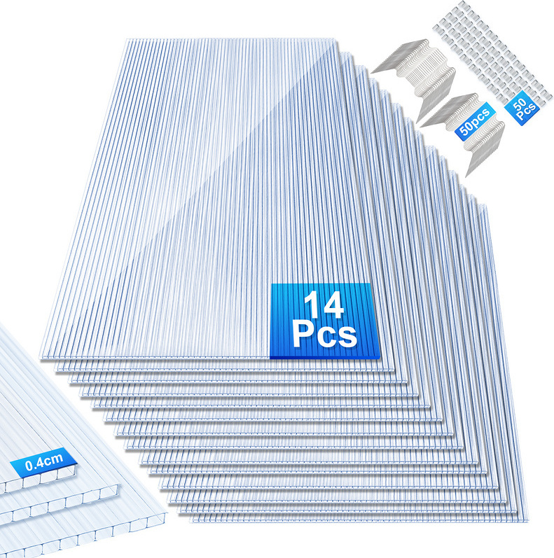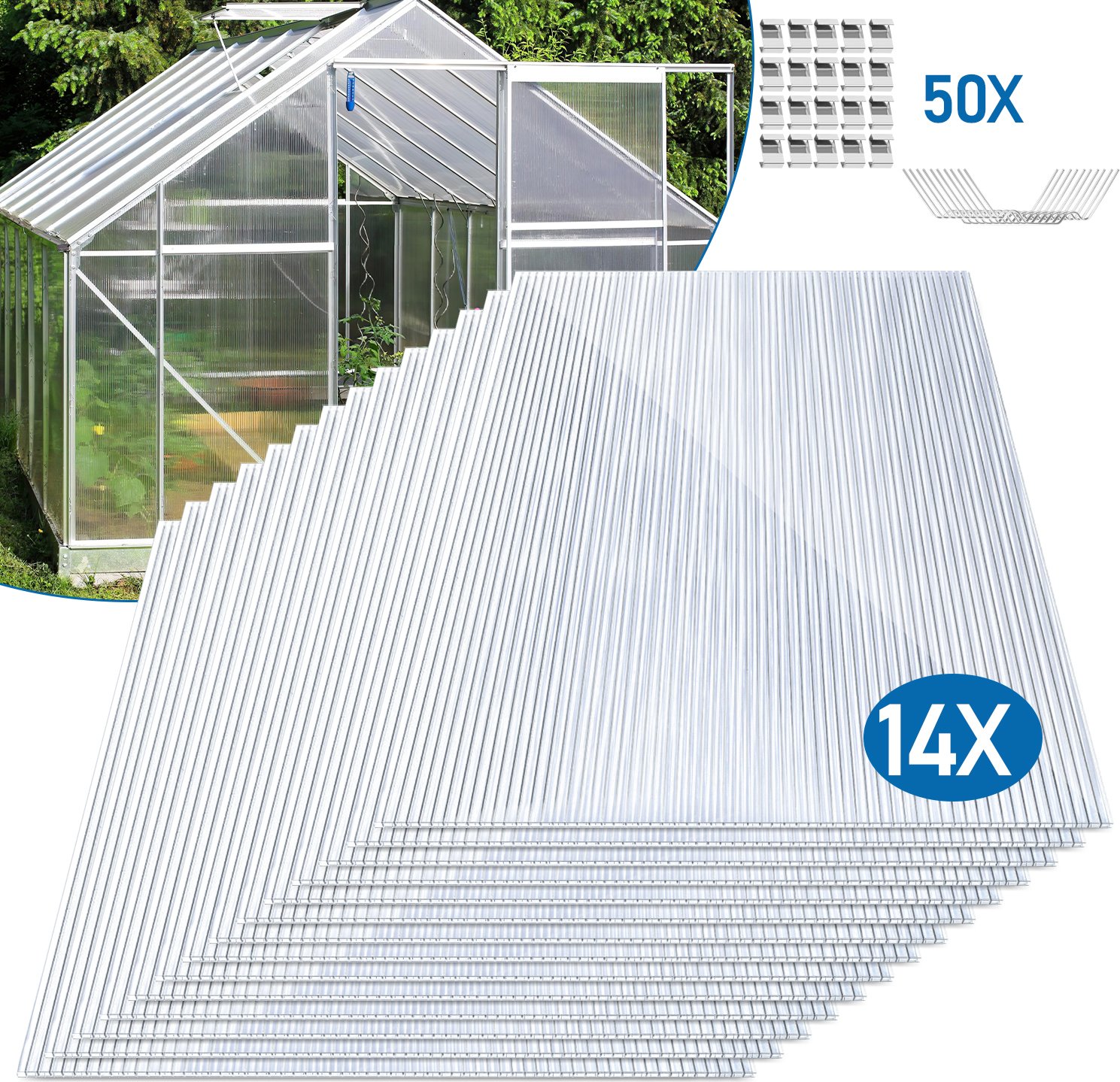 Gimisgu Lot de 14 plaques alvéolaires en polycarbonate de 4 mm, 10,25 m², 50 pinces, 50 clips Z, 60,5 x 121 cm, double plaque alvéolaire, résistante aux UV pour serre FG-G9139-1