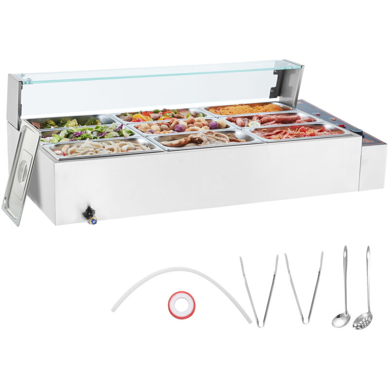 VEVOR Chauffe-Plat Buffet a 9 Bacs de 4,7 L, Bain-Marie Electrique 1500 W, Buffet Chauffant en Inox, Ecran en Verre, Temperature Reglable 30-85 °C,
