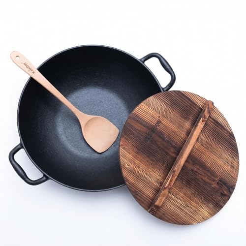 Keleday Wok en fonte de 35,6 cm avec couvercle, poêle à frire antiadhésive et poêle à frire pour toutes les cuisinières, y compris l'induction, le gaz, l'électricité, le four