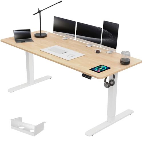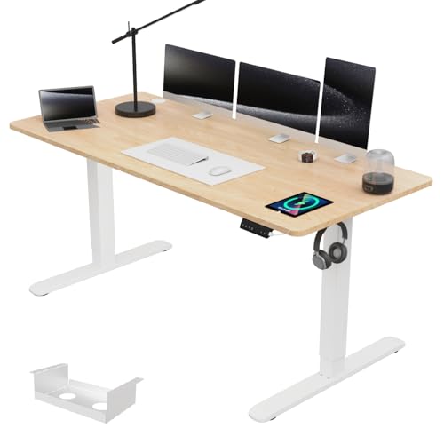FLEXISPOT Bureau Assis Debout 100x60cm, Plateau Complet, Bureau Réglable en Hauteur Électrique, Informatique avec Crochet(Cadre Blanc+Plateau Érable)