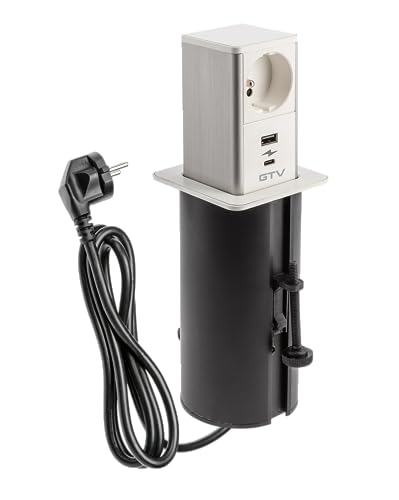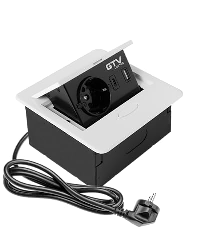 GTV - Prise de meuble Tower, prise encastrable extensible, 1 prise française, 1 x USB A, 1 x USB C, longueur du câble 1,5 m, couleur blanche, pour bureau, plateau de table, cuisine et bureau