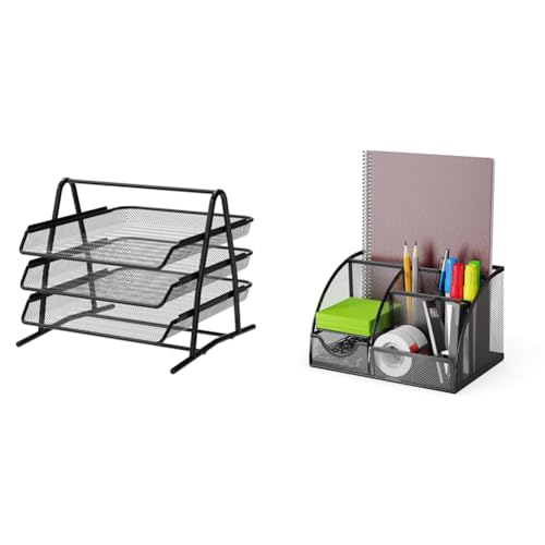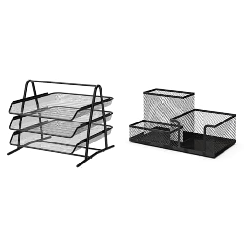 Detectalia Plateau Organisateur de Bureau et de Documents 3 Niveaux Noir. Dossier A4 & Organisateur de Bureau et Porte-stylos en Maille métallique Noire - Accessoires de Bureau