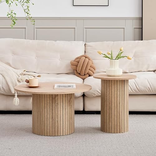 GrandCA HOME Lot de 2 Tables Basses Rondes, Table d'appoint Ronde pour Canapé, Plateau en MDF avec Sommier à Lattes en Bois, Convient pour Salon et Bureau(Grain de Bois Naturel)
