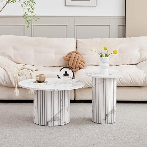 GrandCA HOME Lot de 2 Tables Basses Rondes, Table d'appoint Ronde pour Canapé, Plateau en MDF avec Sommier à Lattes en Bois, Convient pour Salon et Bureau(Marbre)